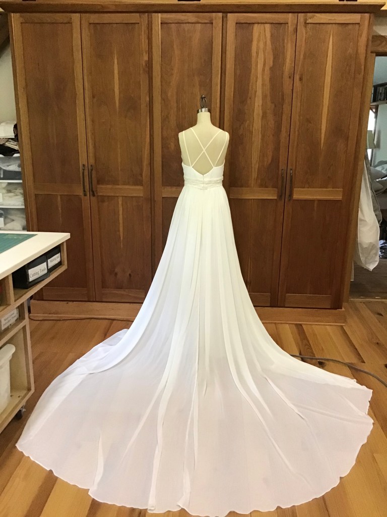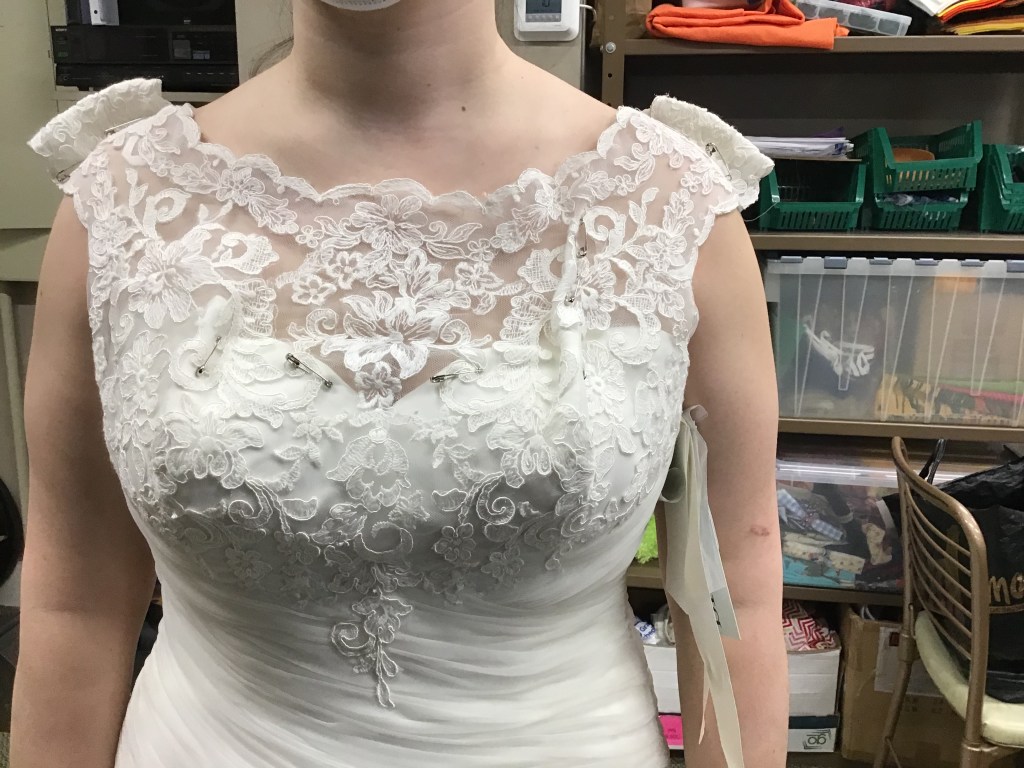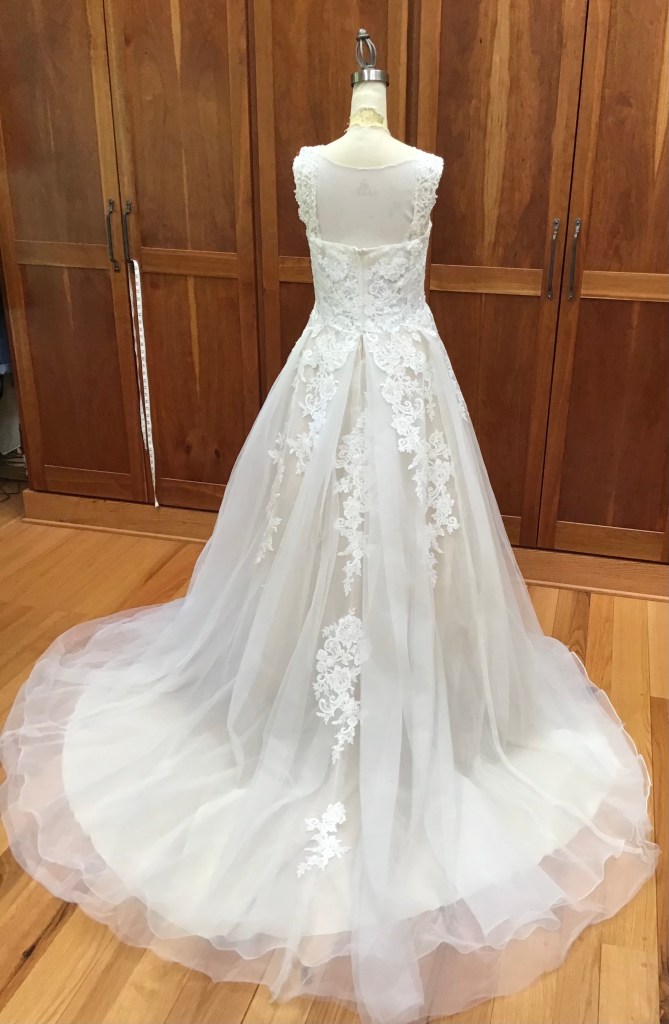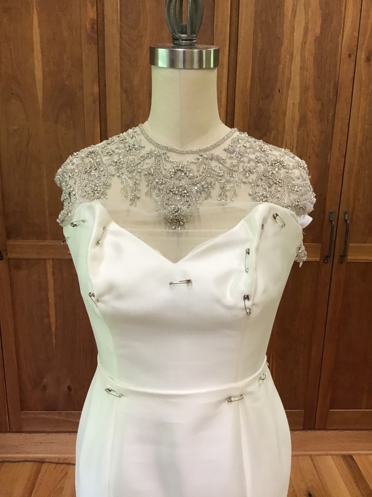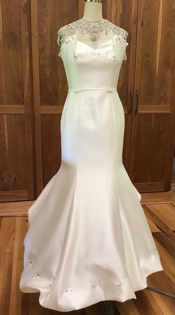 Leila asked me to add straps. We hemmed it up and added a ballroom bustle, which looked great with her ball gown! At the fitting she also asked that I take in the bodice for a more defined waist.