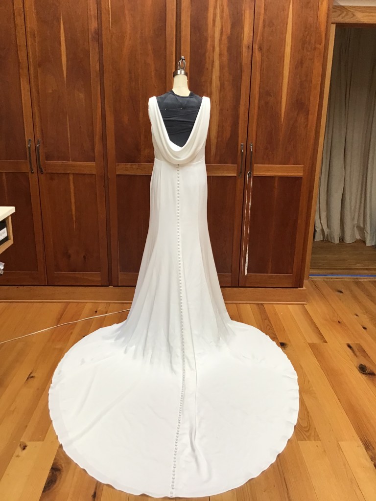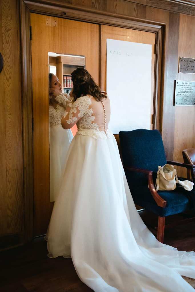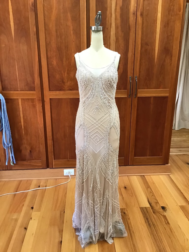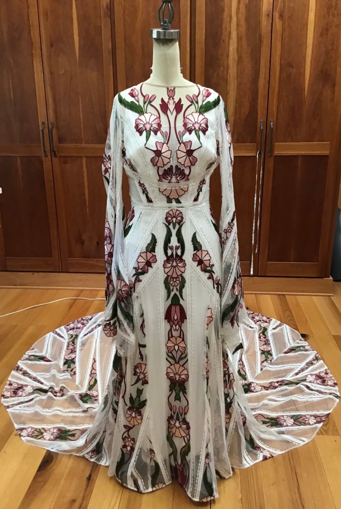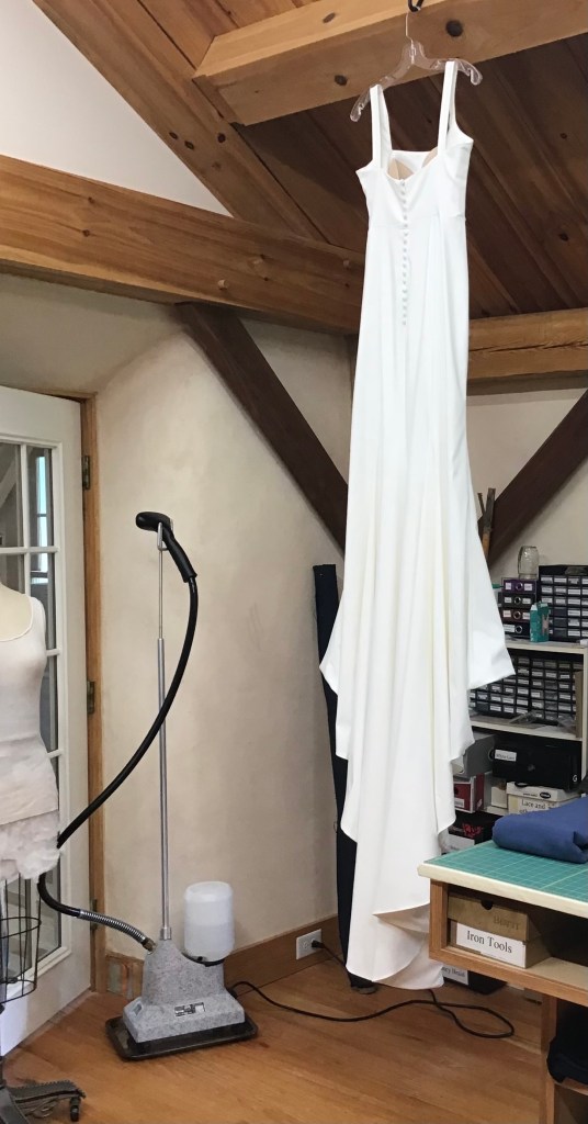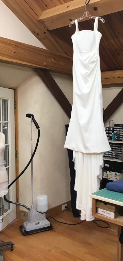 Leila asked me to add straps. We hemmed it up and added a ballroom bustle, which looked great with her ball gown! At the fitting she also asked that I take in the bodice for a more defined waist.