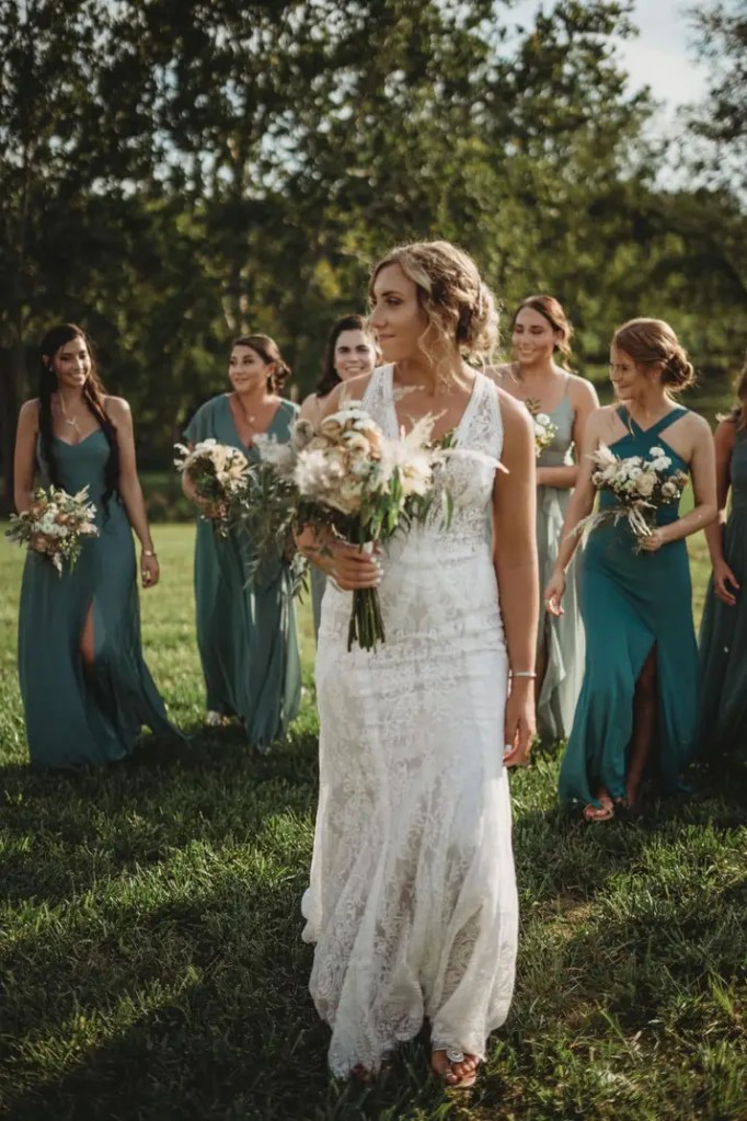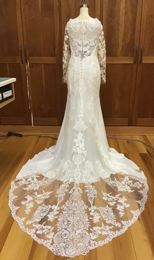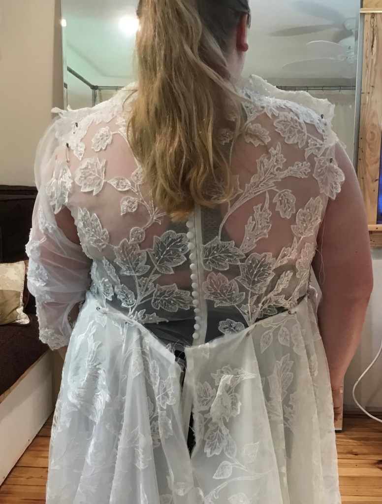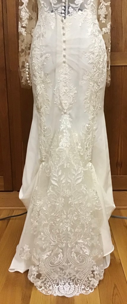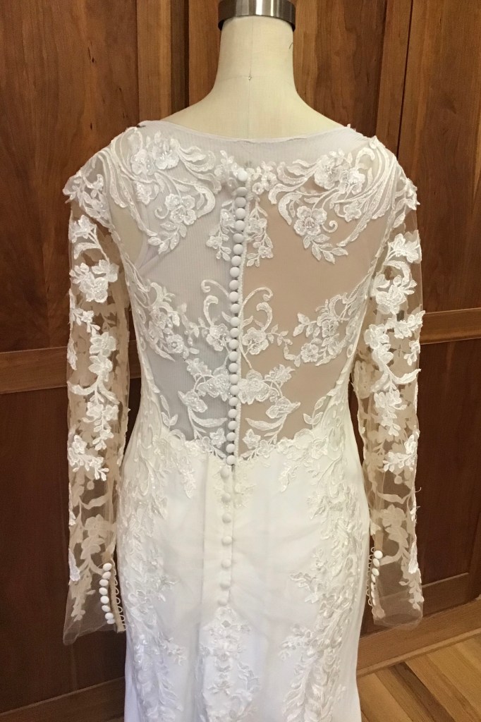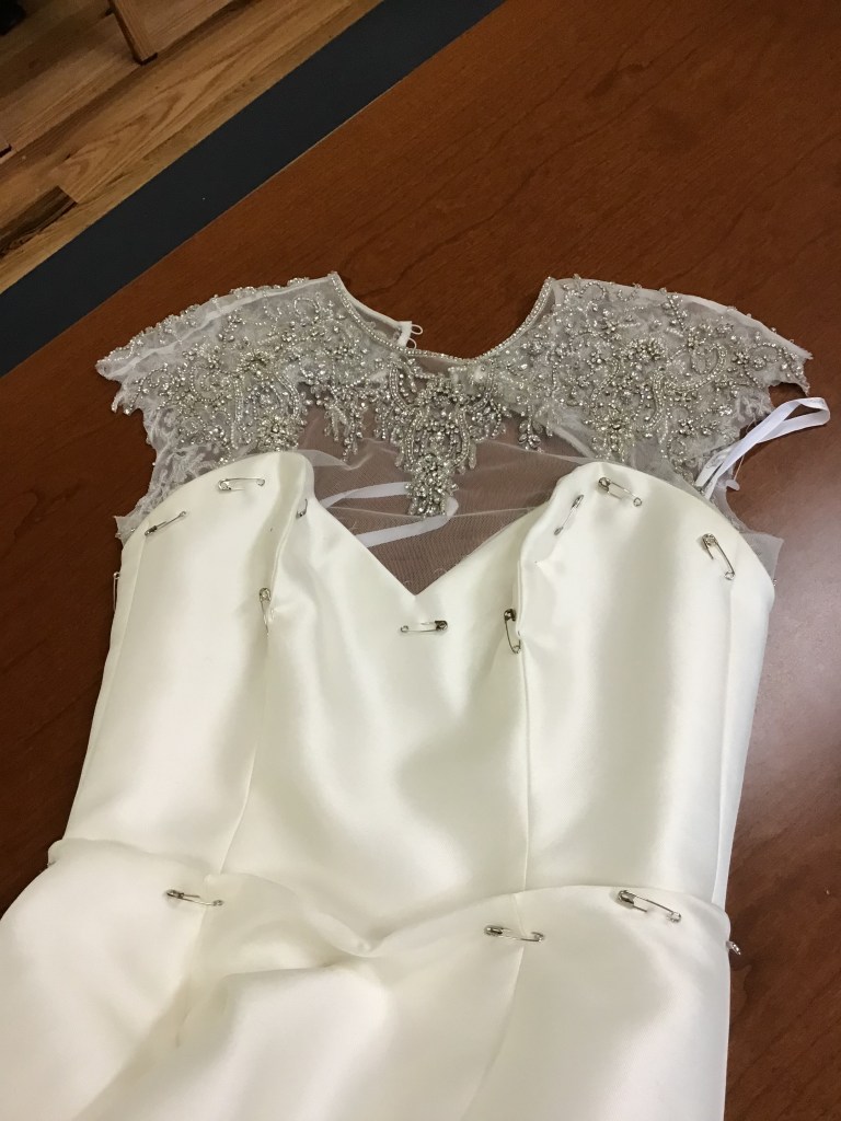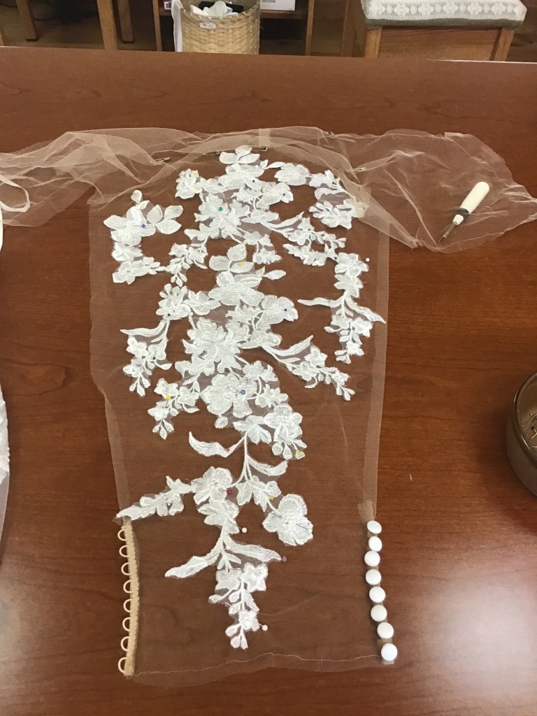 RaeAnn got a great deal at a bridal shop that was closing, but it was really big on her. She loved the beading and lace so she wanted to make it work. I took off the skirt and the sleeves, reshaped it all and reassembled. She went with a three quarter sleeve and looked beautiful for her Fall wedding!