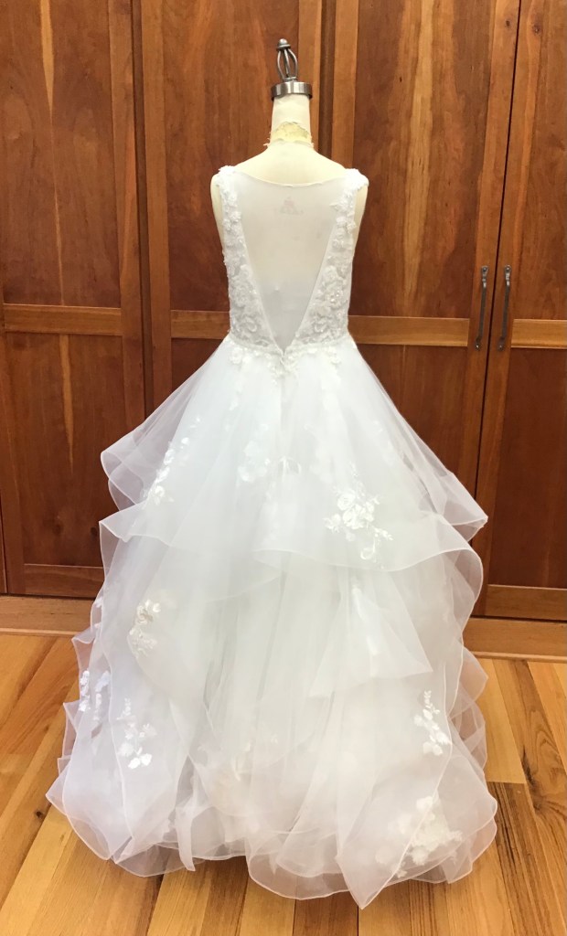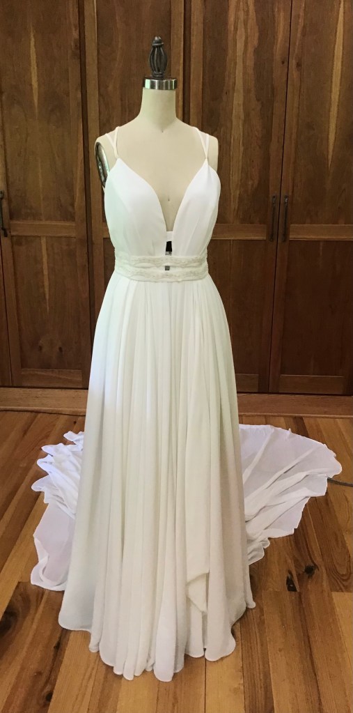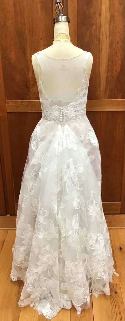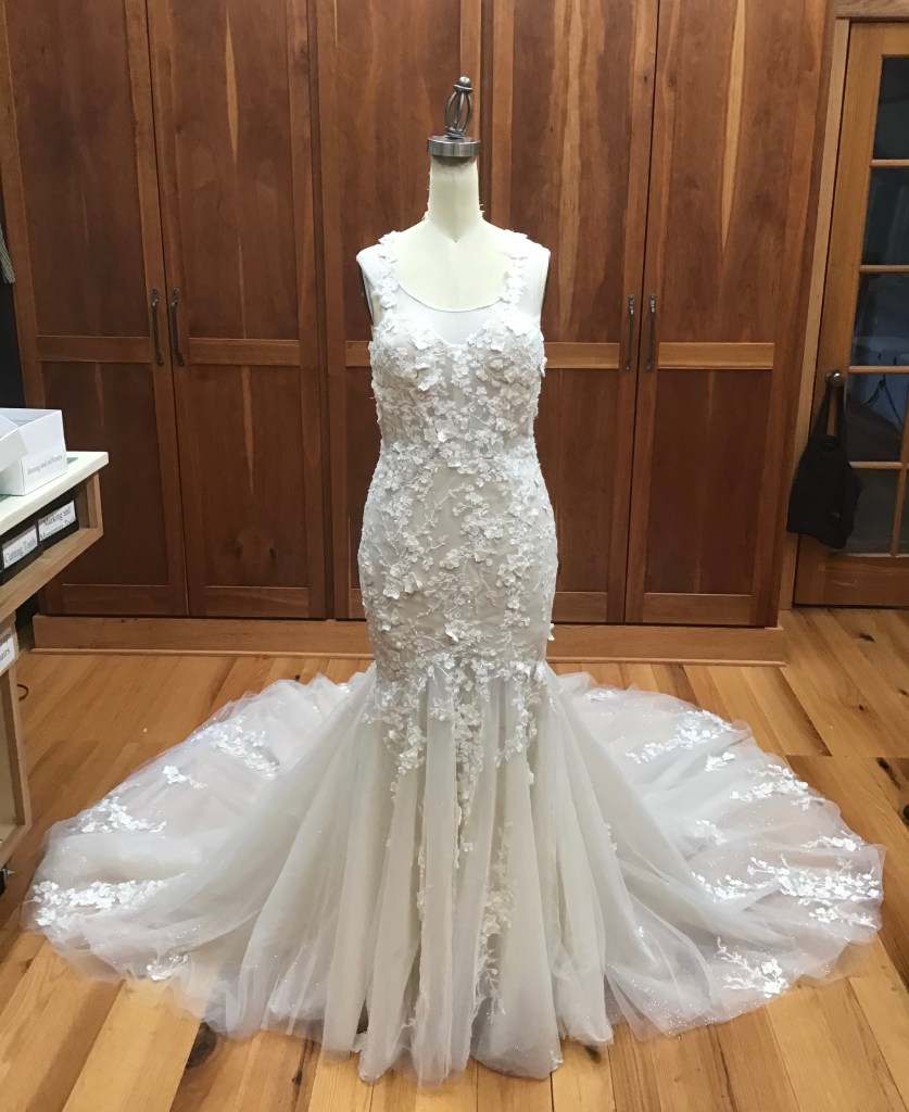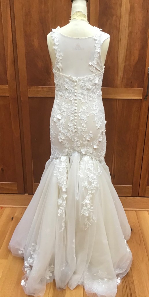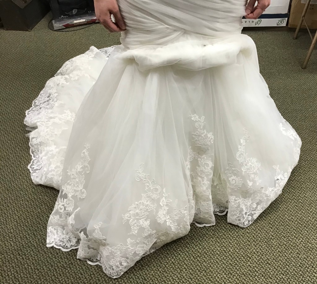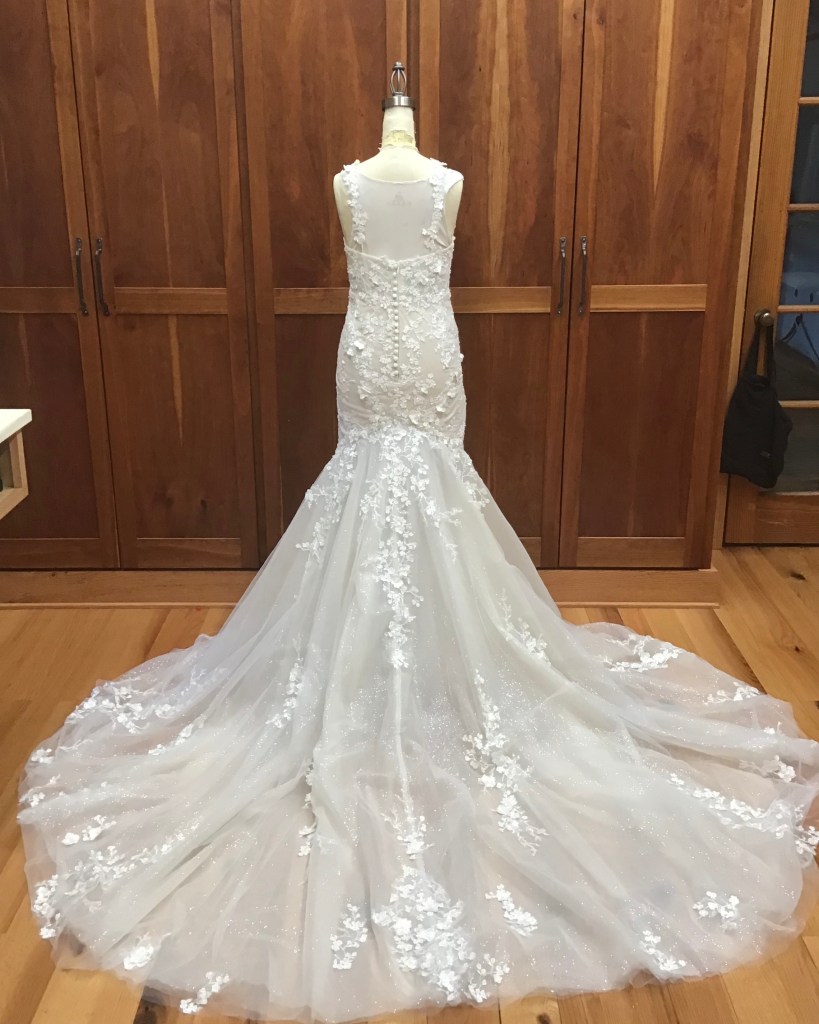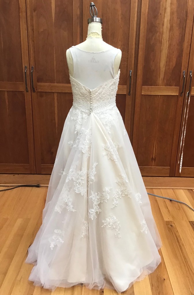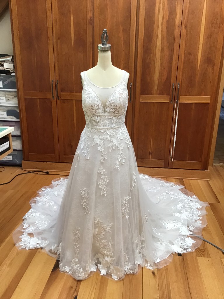 A two piece skirt and body suit from Church Street Bridal in Lynchburg Virginia. I added boning and structure to the body suit and attached it to the skirt to make her dream wedding gown.