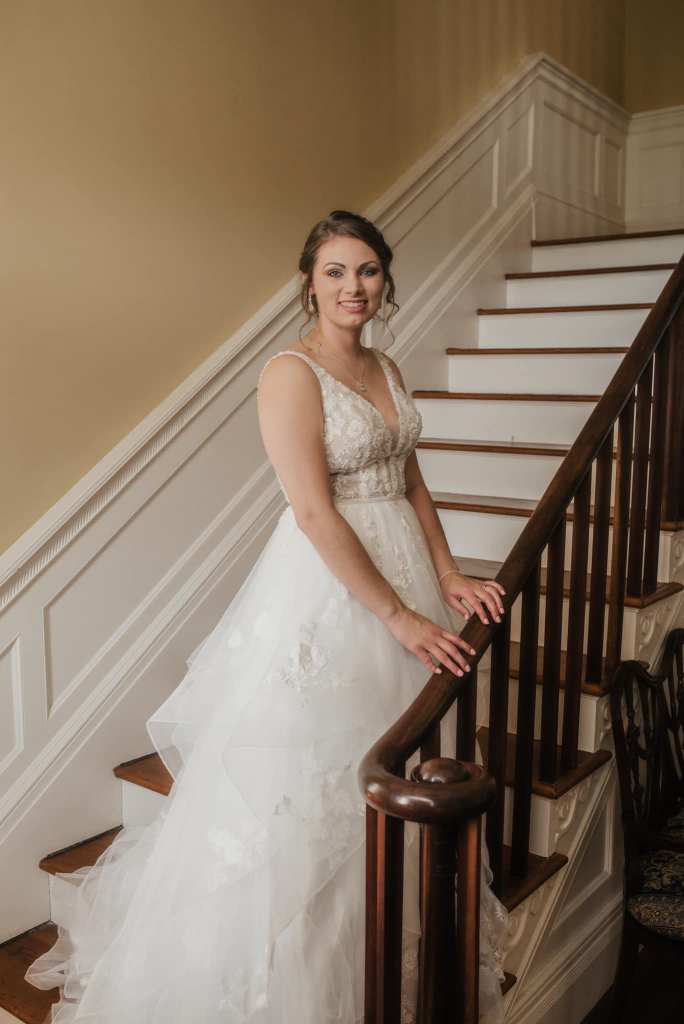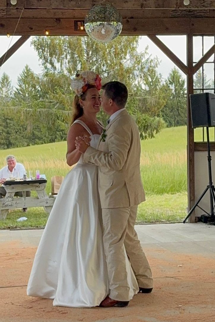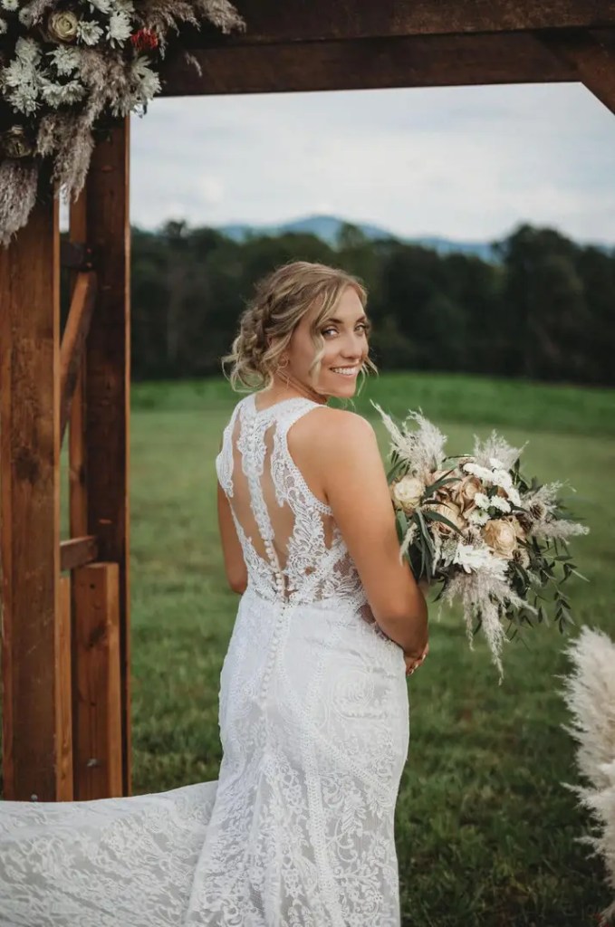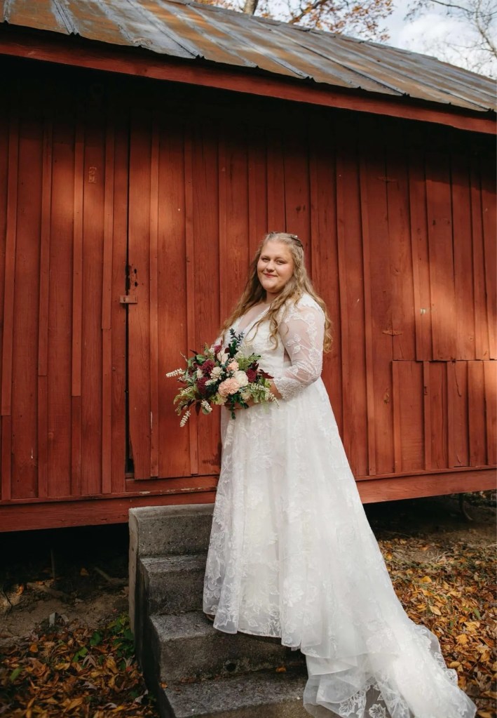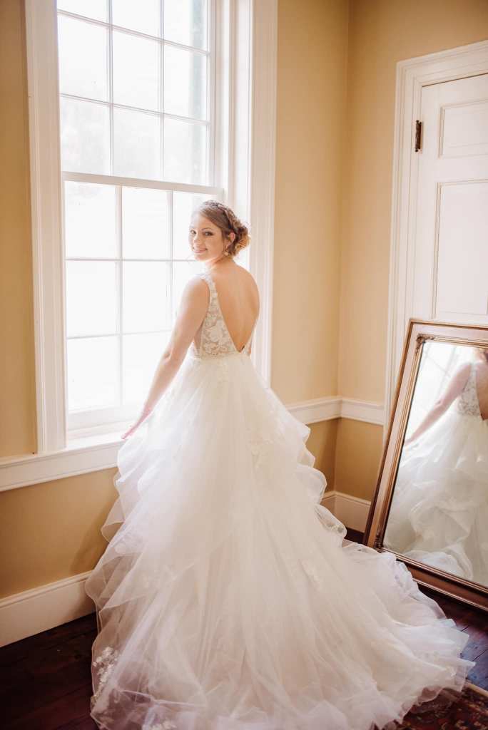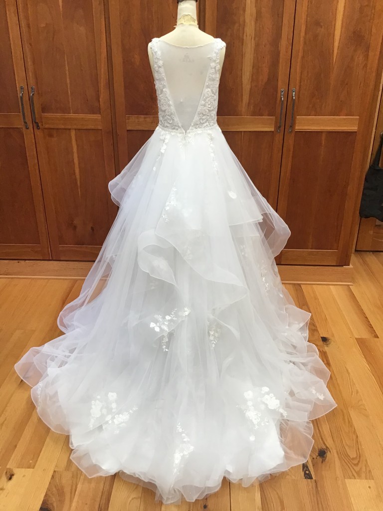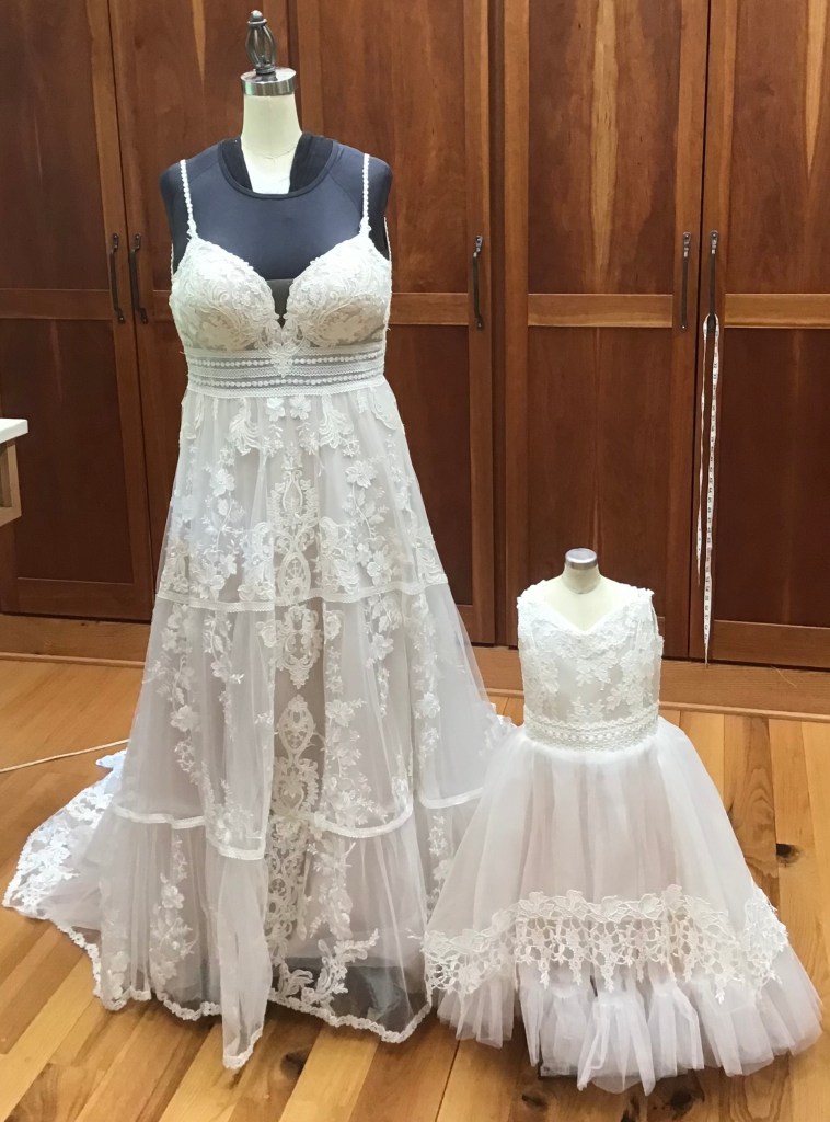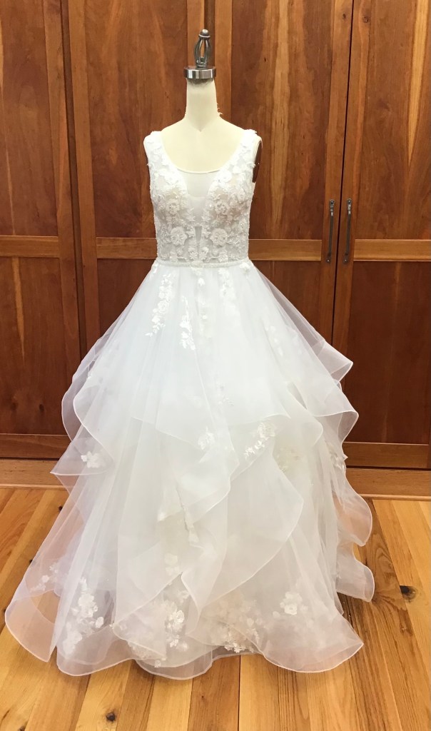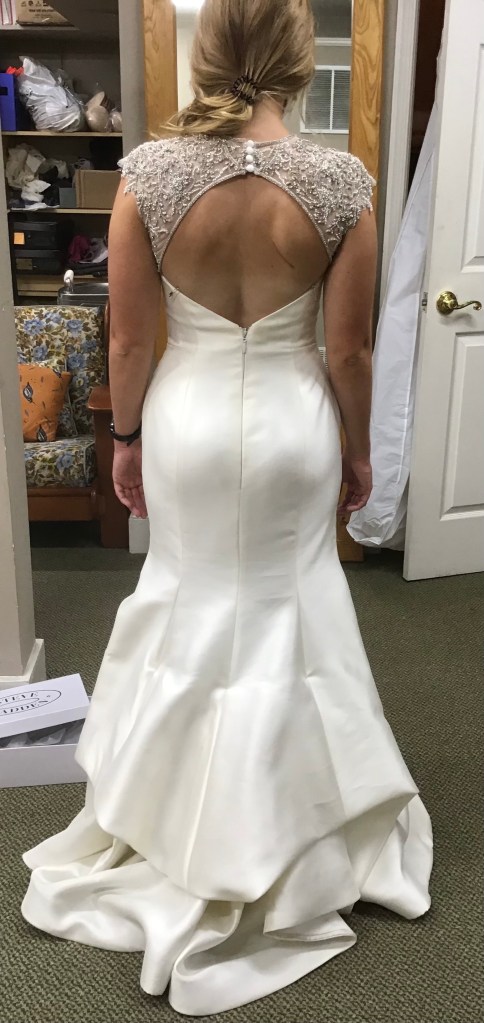 A two piece skirt and body suit from Church Street Bridal in Lynchburg Virginia. I added boning and structure to the body suit and attached it to the skirt to make her dream wedding gown.